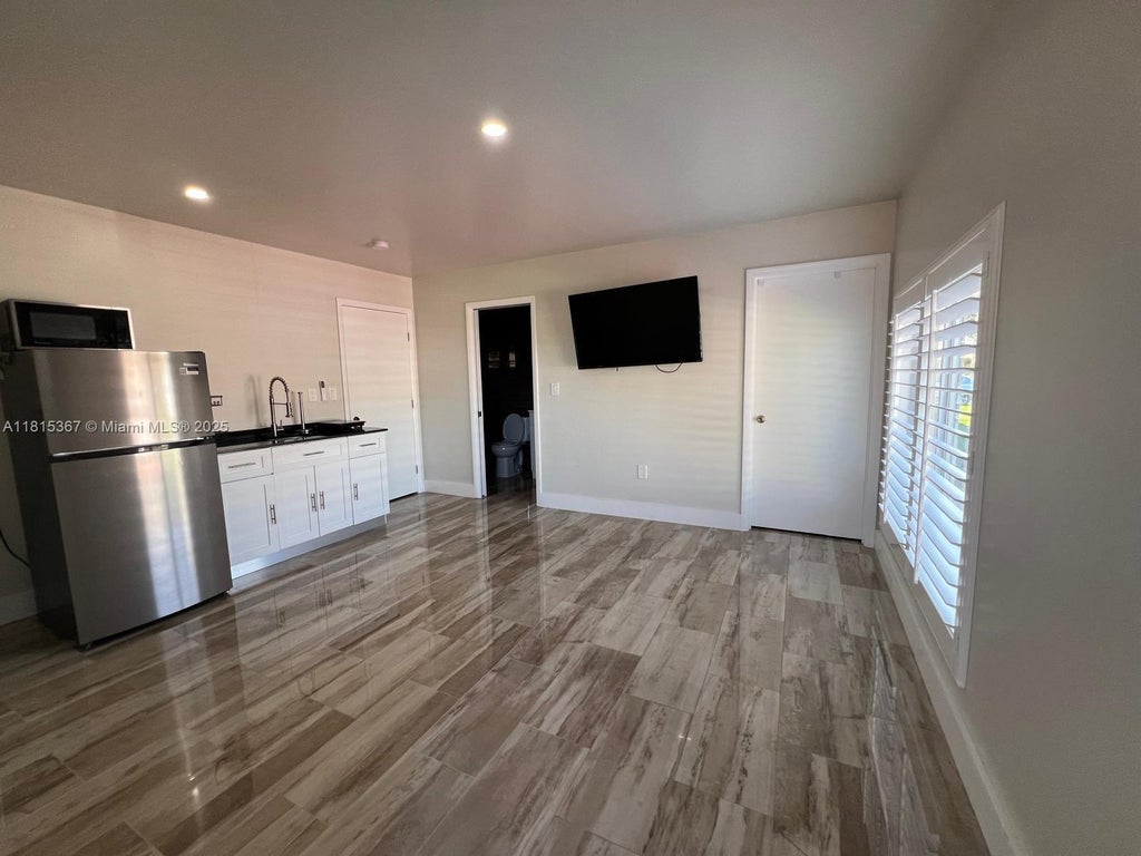 entrance, sleek tile floors, modern kitchenette, full bathroom, A/C unit, and mounted TV. Bright space with lots of natural light and private patio area. Perfect for 1 person. Located in a quiet neighborhood with easy access to shopping, dining, and highways. ??Water, electricity, and internet included! ??Move-in ready!