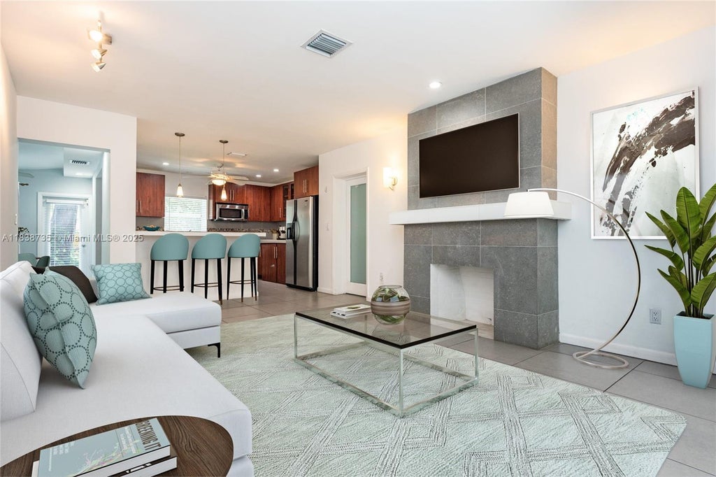 Amazing retreat! Special opportunity to live in El Portal's charming, historical Sherwood Forest! Lush foliage surrounds quiet, winding streets with roaming Peacocks. This home has been renovated w/updated kitchen, baths, A/C, security system, and custom lighting. Fenced private backyard. Impact windows & doors add to quiet, security, and energy efficiency. Max. 2 adults. Sq.ft. reflects added formal dining room/Fl.room.