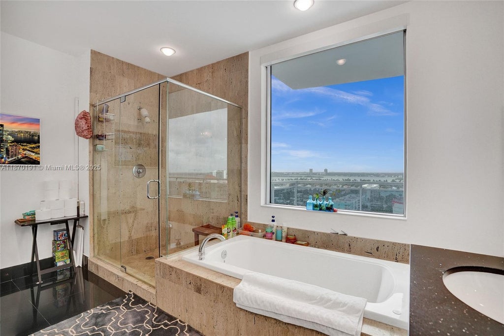 Step into a home where every day feels like a getaway. This renovated 2BD+Den,3BA corner residence spans nearly approx. 1750 SF with soaring 10.ft ceilings and a 600 SF wraparound balcony framing dazzling bay & skyline views. Light pours through impact glass doors onto sleek white porcelain floors,while smart-home features,motorized shades,a chic Italian kitchen with new appliances create effortless living. The primary suite offers a spa-like bath with jetted tub, glass shower & picture window overlooking downtown. Den is converted to a 3rd bedroom with its own full bath. The Lexi delivers resort-style amenities: infinity pool, modern gym & 24 hr. security. Ready to move in and start your waterfront lifestyle!