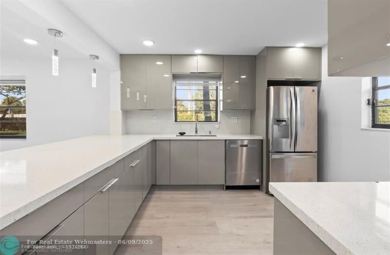 STUNNING, FULLY REMODELED FIRST-FLOOR CONDO WITH LUXURY FINISHES!This one-of-a-kind unit boasts a gorgeous open-concept design with a quartz island and extended bar area, complemented by stainless steel appliances. High vaulted ceilings with LED flush lighting illuminate the main living areas, creating a bright and spacious feel. Enjoy the convenience of a separate laundry room with full attic access, a dedicated office space, ample storage, and sleek quartz countertop Elegant flooring flows seamlessly throughout the home adding a designer touch.