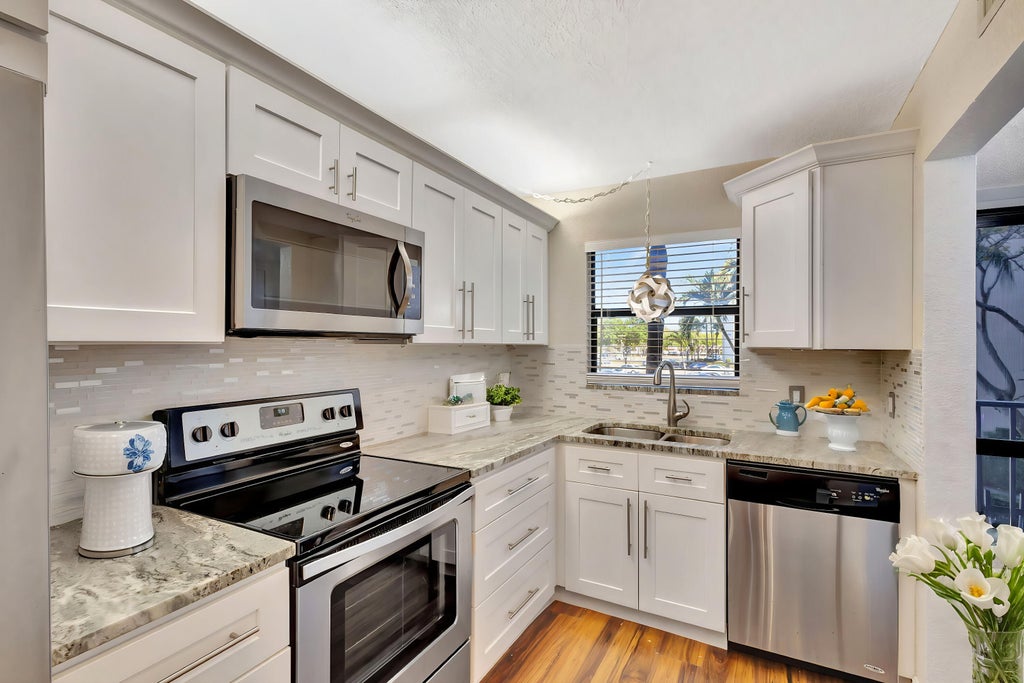 Incredible value! This beautifully remodeled 2BR, 2BA condo (55+ Community) offers a stylish living space with freshly painted walls, a brand-new dishwasher, laminate wood floors, stainless steel appliances, white shaker wood cabinets, exquisite granite countertops, and updated vanities in both bathrooms--In unit washer/dryer is permitted upon submission and approval by the (ARB). With modern finishes and an inviting layout, this home is perfect for relaxation and entertaining. Located in a resort-style community, you'll have access to a terrific clubhouse, making every day feel like a getaway.Conveniently located, this home is just minutes from the movie theater, shopping, dining, the Turnpike, and PBI Airport, with the ocean only 20 minutes away. Don't miss this incredible opportunity!