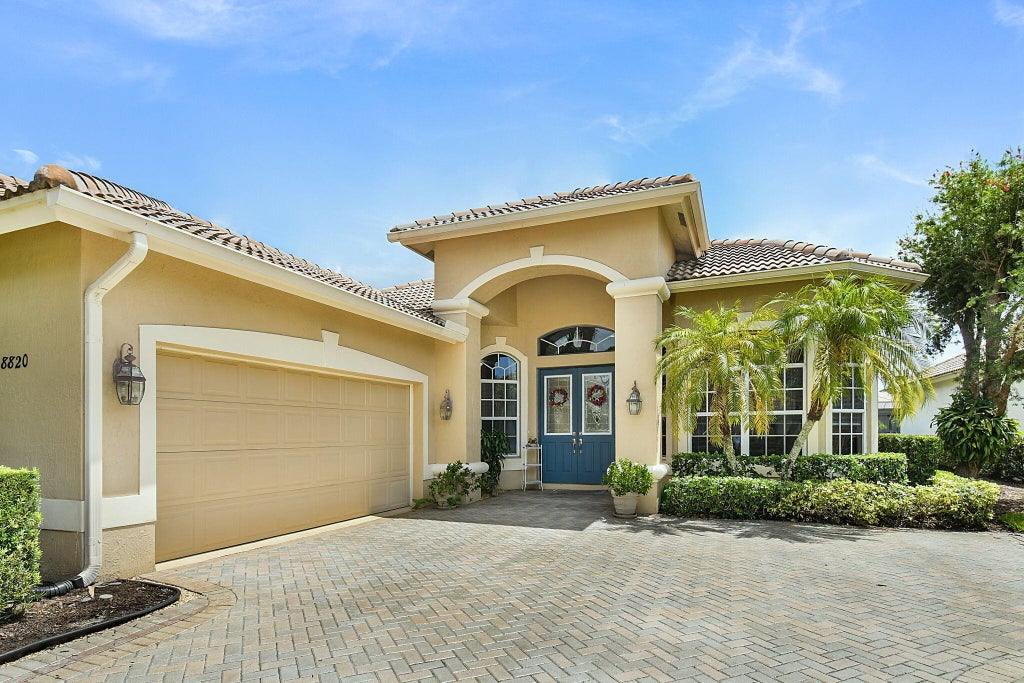 BRAND NEW ROOF IS FINISHED! Seeking a home with a water view...in a gated community...with access to optional golf and social memberships? Need a space where you can have room to entertain large groups? I've got the perfect match for you. This is a one-owner home presented with obvious pride of ownership and a warmth that grabs you as soon as you walk in. The claim to fame is that this was the first home built behind the South Gate of PGA Village back in 2000. This Seller has seen decades of changes through the walls of this home, and now they are ready to pass it on to another family that will make new memories.As soon as you enter the spacious foyer, you will notice the bright and open floorplan with an immediate view of the lake through the sliders. To the right is the formal dining room, where if you peek out the window, you'll see an AMAZING orchid plant hanging from the tree. When it blooms, it's stunning! To the left is the first guest room, which has a Murphy bed in the place of where a closet was intended. (Murphy bed will convey with sale.) There is a half-bathroom across the hall. Consider this a dual master, as the second guest room has its own bathroom with tiled shower and updated vanity. In the owner's suite, you'll find tray ceilings, dual walk-in closets, and a showstopper bathroom equipped with dual sinks, vanity counter, tub, separate shower, and private toilet room (what fancy people call a water closet). Wake up in the morning to the glowing sun over the lake through your bedroom windows. The kitchen has beautiful wood cabinets, granite countertops, stainless steel appliances, and undercabinet lighting. When designing the kitchen, the owners were smart to install a hidden power strip under the cabinets, so that they didn't have to have outlets cut into the backsplash. The oversized breakfast nook is a direct extension to the kitchen and has housed many gatherings with a super long table and over 20 guests. The massive lanai features a covered and screened area to stay out of the weather and a space big enough for a dance party! You'll also find a hot tub installed in the deck, for those night where you just want to have a soak! Out front, the paver driveway leads to the side-entry 2-car garage, which also includes an additional golf cart garage space. Need a workshop or office in addition to the home's interior space? The Sellers have supplied heat and A/C to the garage and partitioned/screened off an area to create an office and painting studio. This is a great way to extend the usable space of the home while still having ample room to park a vehicle. Big ticket updates include the A/C and water heater (2022) and a new roof is about to be installed. PGA Village is a very active community that has something for everyone to do. It's like living in a resort. Stay fit by taking a swim in the resort style pool, playing a game of pickleball or tennis, shooting some hoops at the basketball courts, or bring the kids to the playground. If you want to stay inside, check out the clubhouse where you can work out in the fitness center, shoot a game of pool, relax in the library, or join a friendly card game. Golf and social memberships are available, but not required. The photos speak for themselves, but you've got to make an appointment and see this place in person to truly appreciate it! Call and book your private showing today!