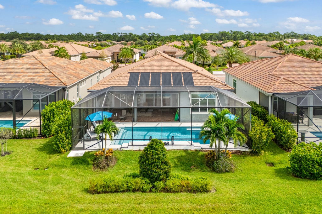 Enjoy luxury living in this beautifully upgraded 3,000sft home, located in prestigious PGA Verano golf community. Step inside to discover a bright open floor plan fully tiled throughout, enhanced by crown molding and custom wall moldings in the dining room and den. Plantation shutters, upgraded fans, and designer light fixtures add a refined touch throughout the home. The spacious open-concept kitchen features a massive quartz island, sleek white cabinetry, wall oven, and stainless steel appliances--a chef's dream and an entertainer's delight. Enjoy outdoor living year-round with the screened-in pool with solar-heat and electric heat backup! The expansive lanai affords privacy complete with electric-powered storm screens for added weather protection. This property backs up to a wide canal, providing a serene setting for relaxing or entertaining. All windows and doors are impact glass, offering both safety and energy efficiency. The home also includes a 3-car tandem garage and a large laundry room with ample storage. Please review the list of upgrades attached in the documents section. Located in the gated community of PGA Verano, residents enjoy access to a state-of-the-art clubhouse, fitness center, pickleball and tennis courts, and a full calendar of social events. Golf enthusiasts will appreciate the private golf cart path to the nearby PGA Golf Clubmembership is optional and subject to availability. HOA dues include: basic cable, high-speed internet, alarm monitoring, lawn care, common area maintenance, gated security, and more. This is more than just a homeit's a lifestyle. Don't miss your chance to own this incredible property in one of the Treasure Coast's premier communities!